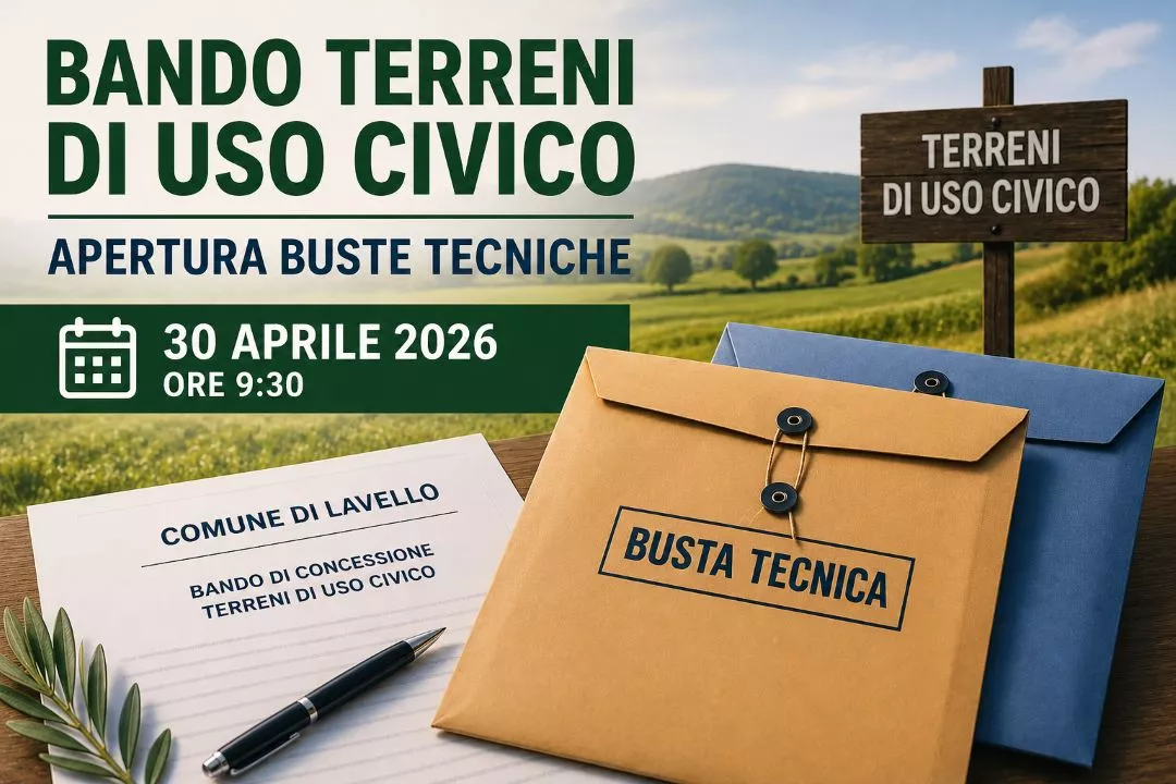 Aggiornata il - 23/04/2026 Pubblicata il - 23/04/2026 Bando terreni di uso civico: apertura buste amministrative il 24 aprile 2026 Si terrà il 24 aprile 2026 alle ore 9:30, presso la sede comunale di Via Cavour, l’apertura delle buste amministrative relative al bando per la concessione di terreni di uso civico.