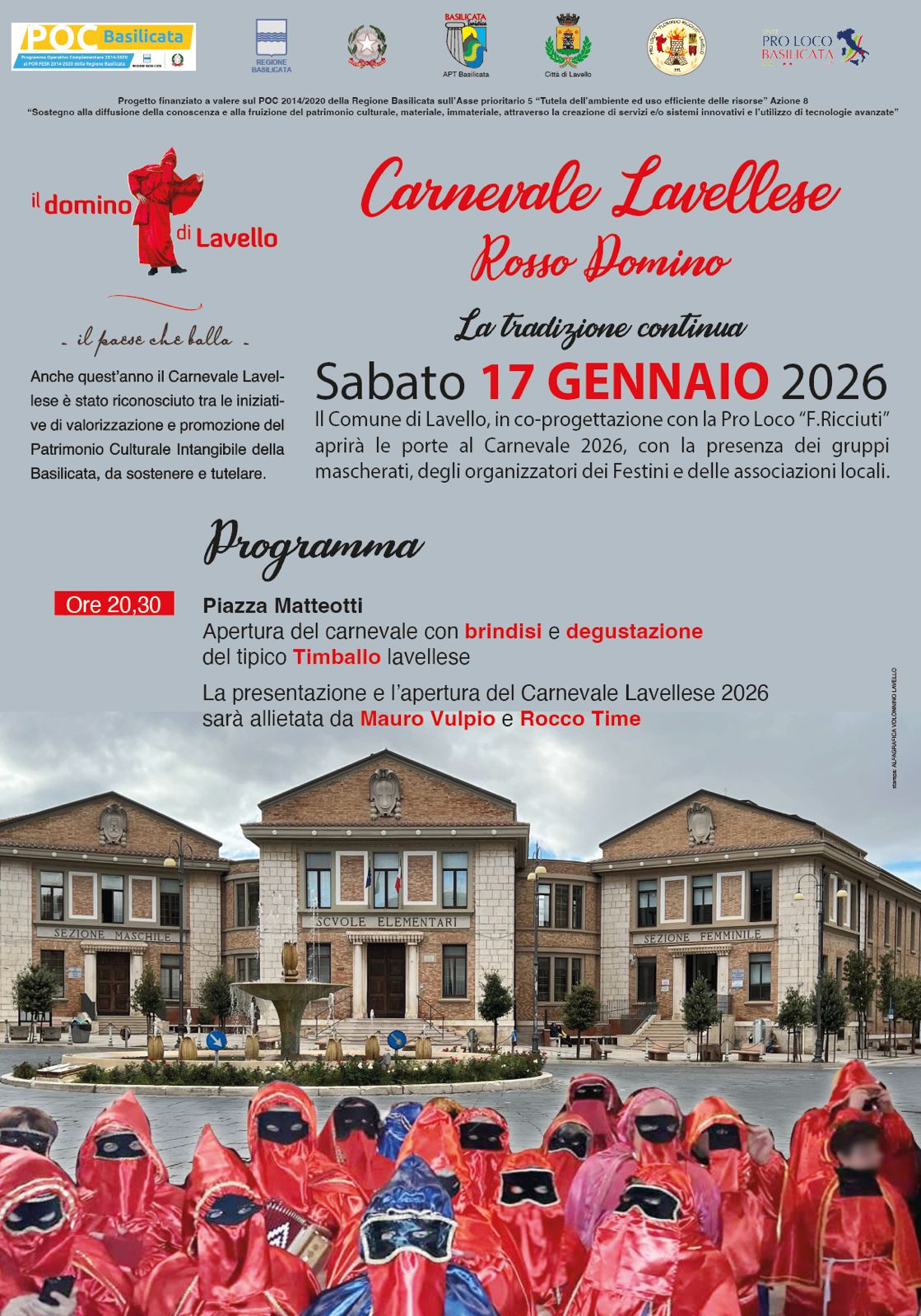 Con questo spirito, il Comune di Lavello, in co-progettazione con la Pro Loco “F. Ricciuti”, annuncia l’avvio del Carnevale Lavellese 2026 – “Rosso Domino”, che prenderà ufficialmente il via sabato 17 gennaio 2026.