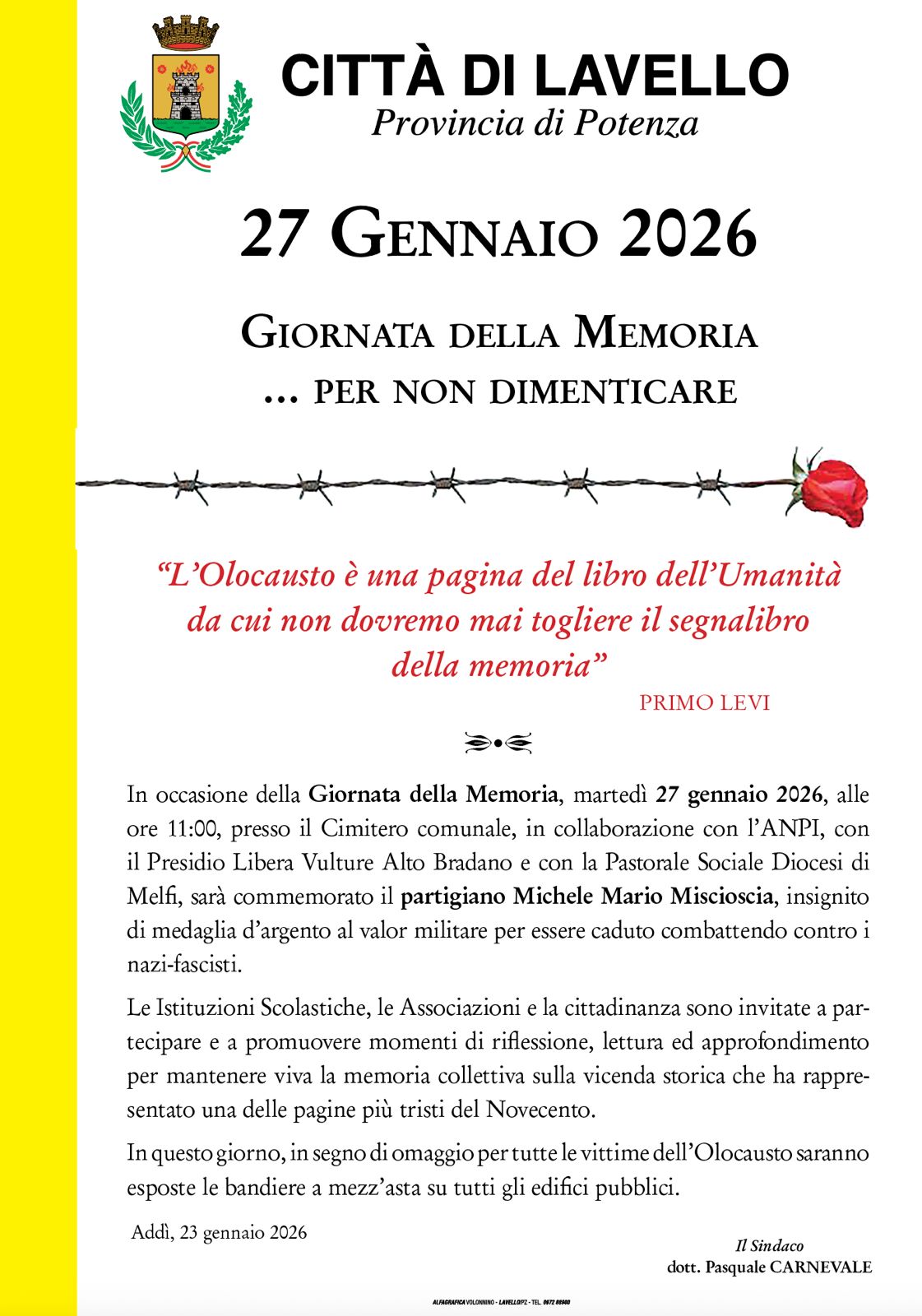 In occasione della Giornata della Memoria, il Comune di Lavello promuove un momento di commemorazione e riflessione dedicato alle vittime dell’Olocausto e alla difesa dei valori di libertà e democrazia.