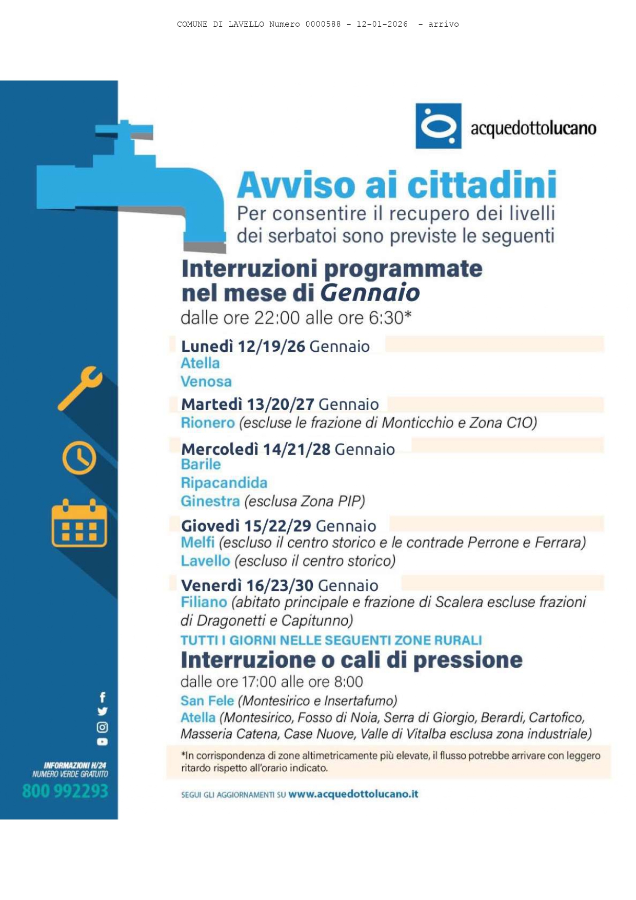 Il Comune di Lavello informa la cittadinanza che Acquedotto Lucano S.p.A. ha comunicato la ripresa del programma di sospensioni idriche notturne, a partire da lunedì 12 gennaio 2026, a causa del perdurare della crisi idrica che interessa il territorio regionale.