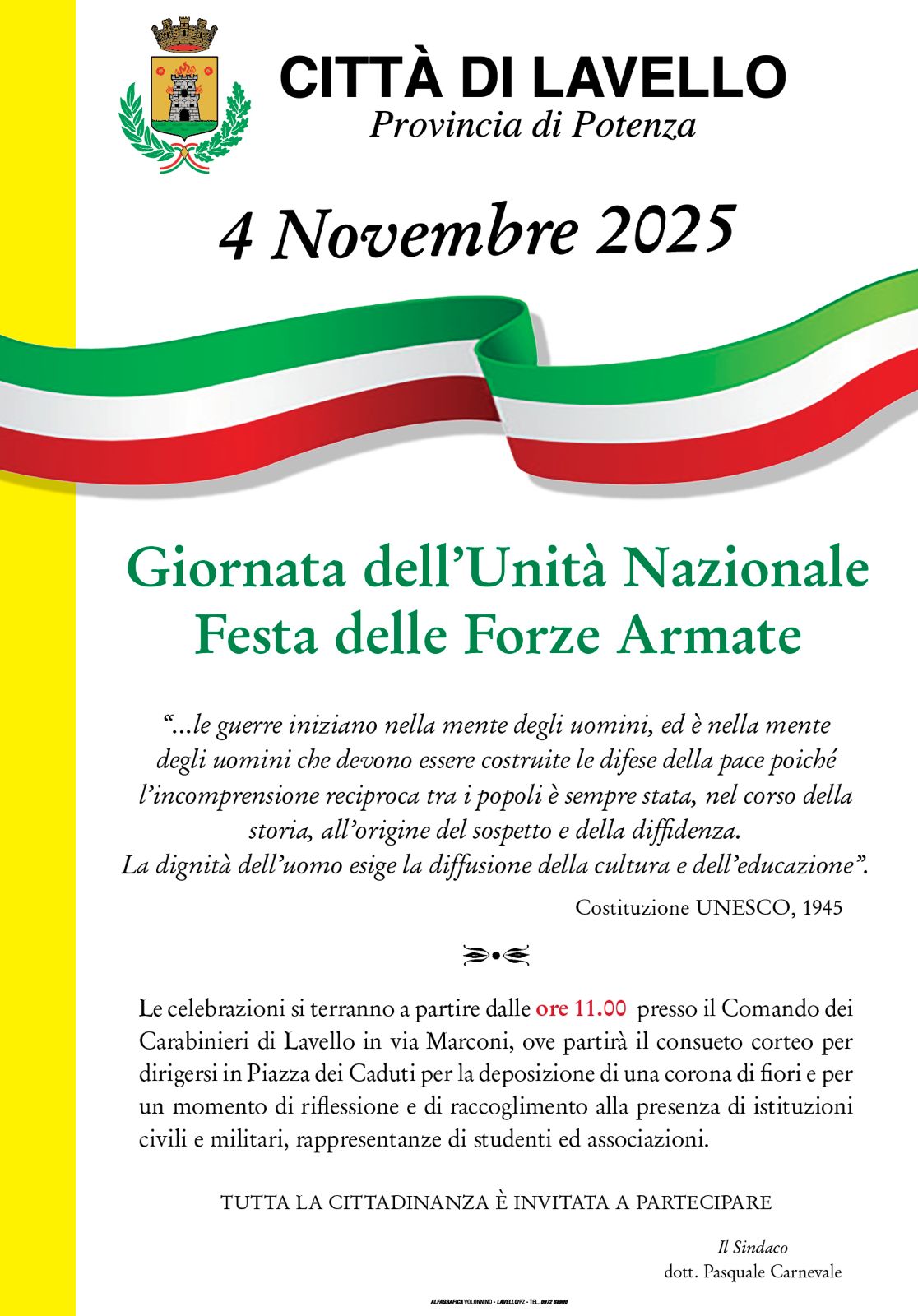 La Città di Lavello, in occasione della Giornata dell’Unità Nazionale e Festa delle Forze Armate, invita la cittadinanza a partecipare alle celebrazioni del 4 novembre 2025.